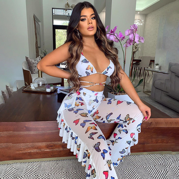 Personalizado nuevo verano Mujer Sexy Bikini Falbala pantalones largos sueltos playa Spaghetti Strap sujetador dos piezas conjunto Bikini